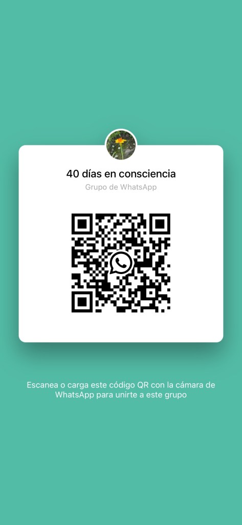 Quieres unirte a mi en el reto 40 Días en consciencia?, en cada día de los 40 que conforman el reto estaré enviando algún tema de estudio o alguna meditación y alguna acción positiva que nos permita manifestar Luz en nuestra vida, lo llevaré a cabo a través de un grupo se whats app, al cual te puedes unir utilizando el siguiente link https://chat.whatsapp.com/GAVqeB0WcvnFxBUm1jkwON O bien puedes usar el siguiente codigo QR