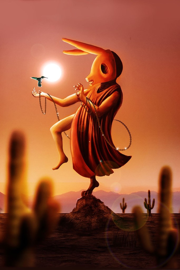 Pasaron muchas semanas antes de llegar a Wirikuta (en el desierto de San Luis, camino sagrado de los Huicholes). Cuando los, jóvenes se encontraban en el camino de la colina, cerca del cerro de las Narices, vieron al venado saltar en dirección al lugar donde habita el espíritu de la tierra. Juraban que habían visto al venado correr en esa dirección, y trataron de encontrarlo sin éxito. De repente uno de los jóvenes disparó una flecha que cayó dentro de la figura de un venado, formada por las plantas de peyote que había en la tierra que, con el sol, brillaban como lo hacen las esmeraldas, mirando hacia una sola dirección.