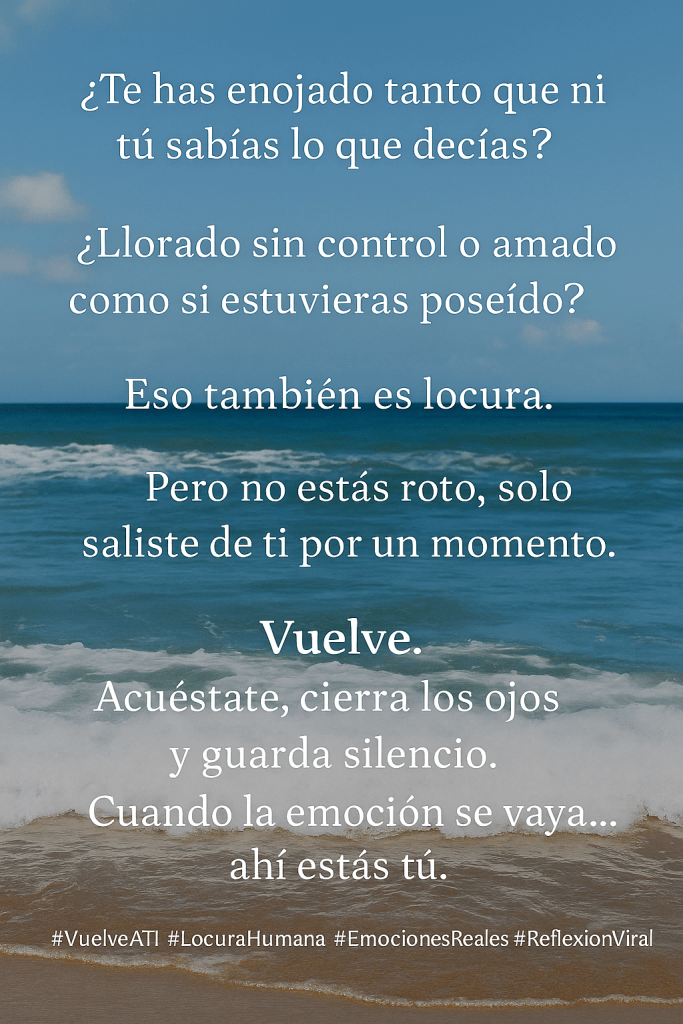 Acuéstate en el suelo. No en la cama, no en el sillón. En el suelo. Que tu cuerpo sienta la Tierra. Cierra los ojos. No intentes calmarte, solo… déjalo todo ahí. No pienses. Deja que la emoción se gaste sola. Se va a ir, como cuando una ola llega y luego se retira. Solo cuando sientas que vuelves a ti, entonces actúa. No desde el enojo. No desde la tristeza. No desde el drama. Desde ti.