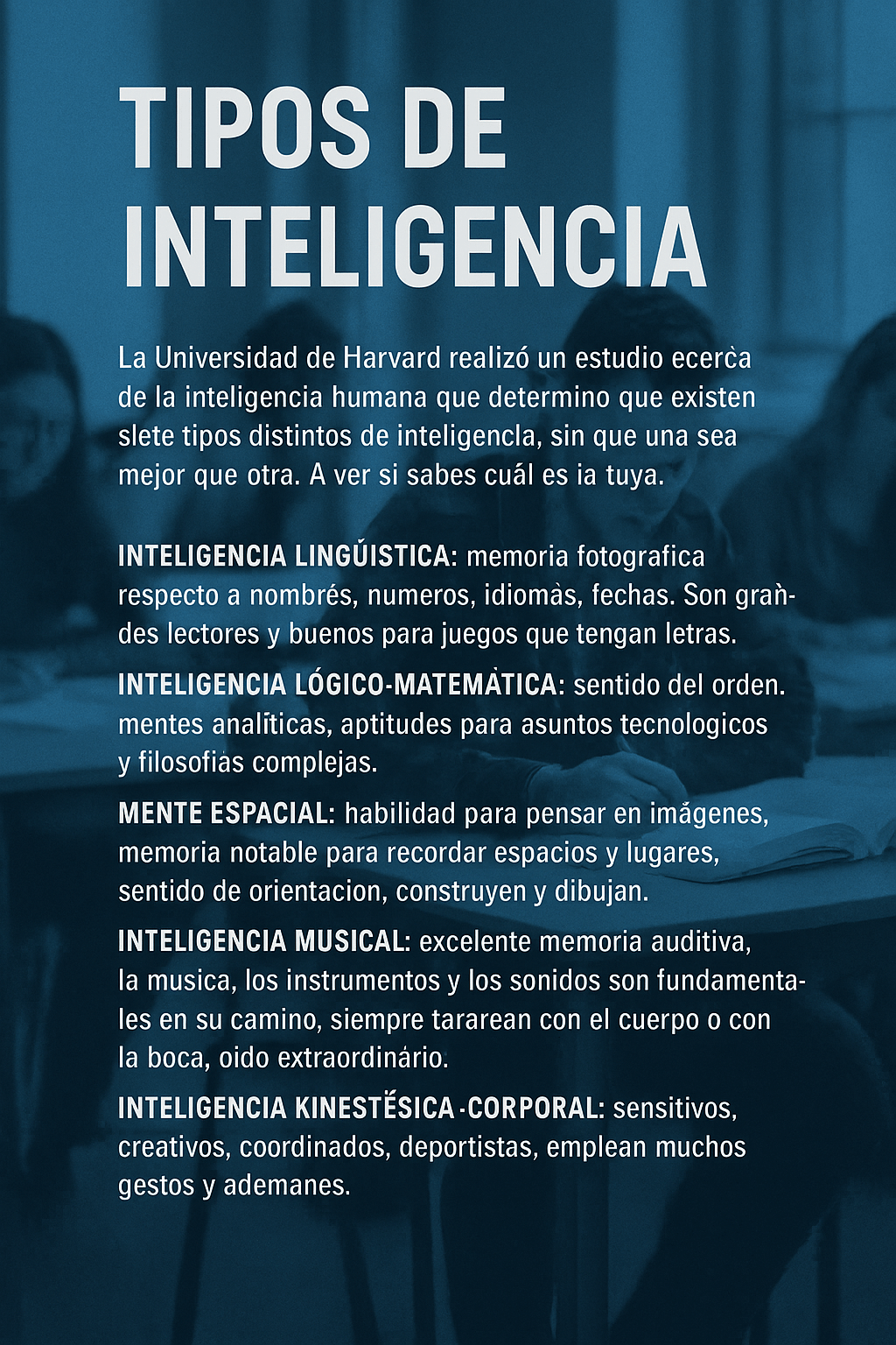 La Universidad de Harvard, a través del psicólogo Howard Gardner, nos mostró que no existe una sola forma de ser “inteligente”, sino varias. Todas las inteligencias son valiosas y ninguna es mejor que otra