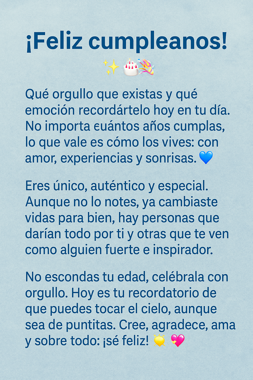 No importa si cumples 10, 30, 50 o 100 años. Lo que importa no es el número, sino cómo eliges vivirlos. Llenarlos de amor, experiencias y aprendizajes; permitirte equivocarte y corregir; dejar de juzgarte tan duro. No existe otra persona con tu rostro, tu historia, tus sueños y tu forma única de ver la vida. Eres auténtico, irrepetible y muy especial para más personas de las que imaginas.