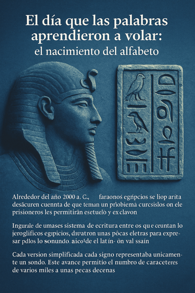 Imagina un mundo donde escribir una simple frase fuera tan complicado que solo unos pocos pudieran hacerlo. Donde para decir “hola” necesitaras dominar miles de símbolos. Así vivían los antiguos egipcios hace más de cuatro mil años. Su escritura —los famosos jeroglíficos— era una maravilla artística, pero un laberinto para cualquiera que intentara entenderla. Cada símbolo representaba una idea, un objeto o un concepto entero. Aprenderlo requería años de estudio, disciplina y una memoria prodigiosa. Era, literalmente, un idioma reservado para los dioses y para los escribas que los servían.