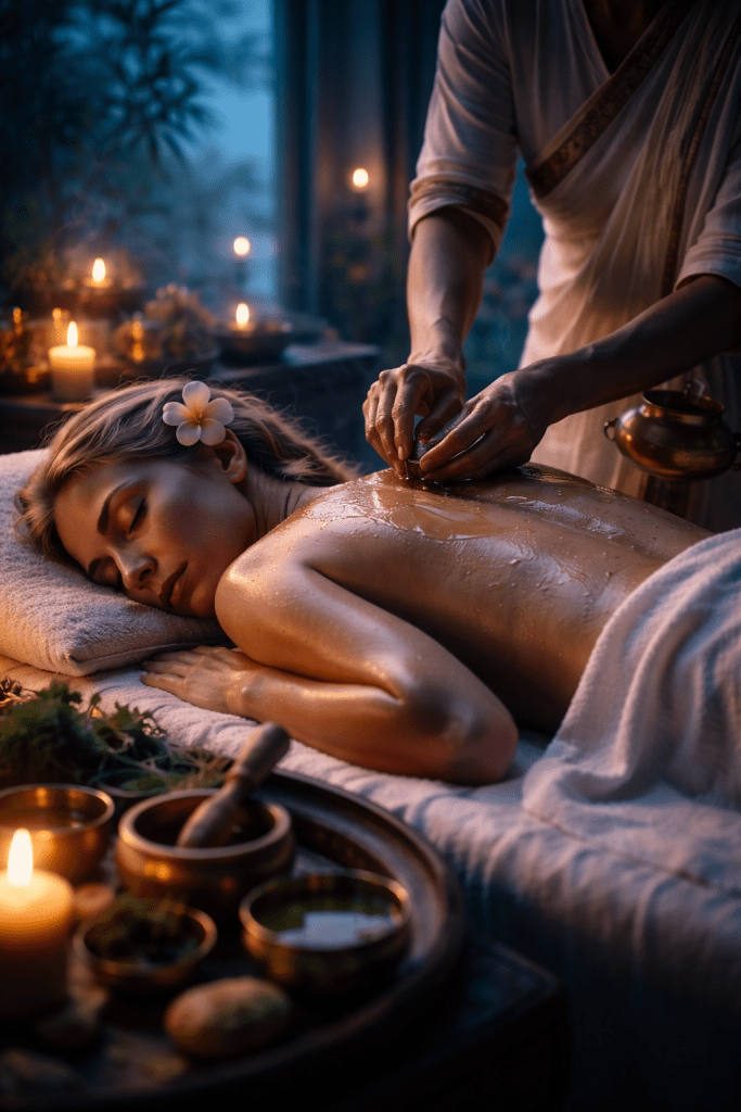 El más conocido es el Abhyanga, masaje con aceites medicinales que nutre los tejidos profundos, calma el sistema nervioso y regula la energía vital. No es solo relajación; es reorganización interna.